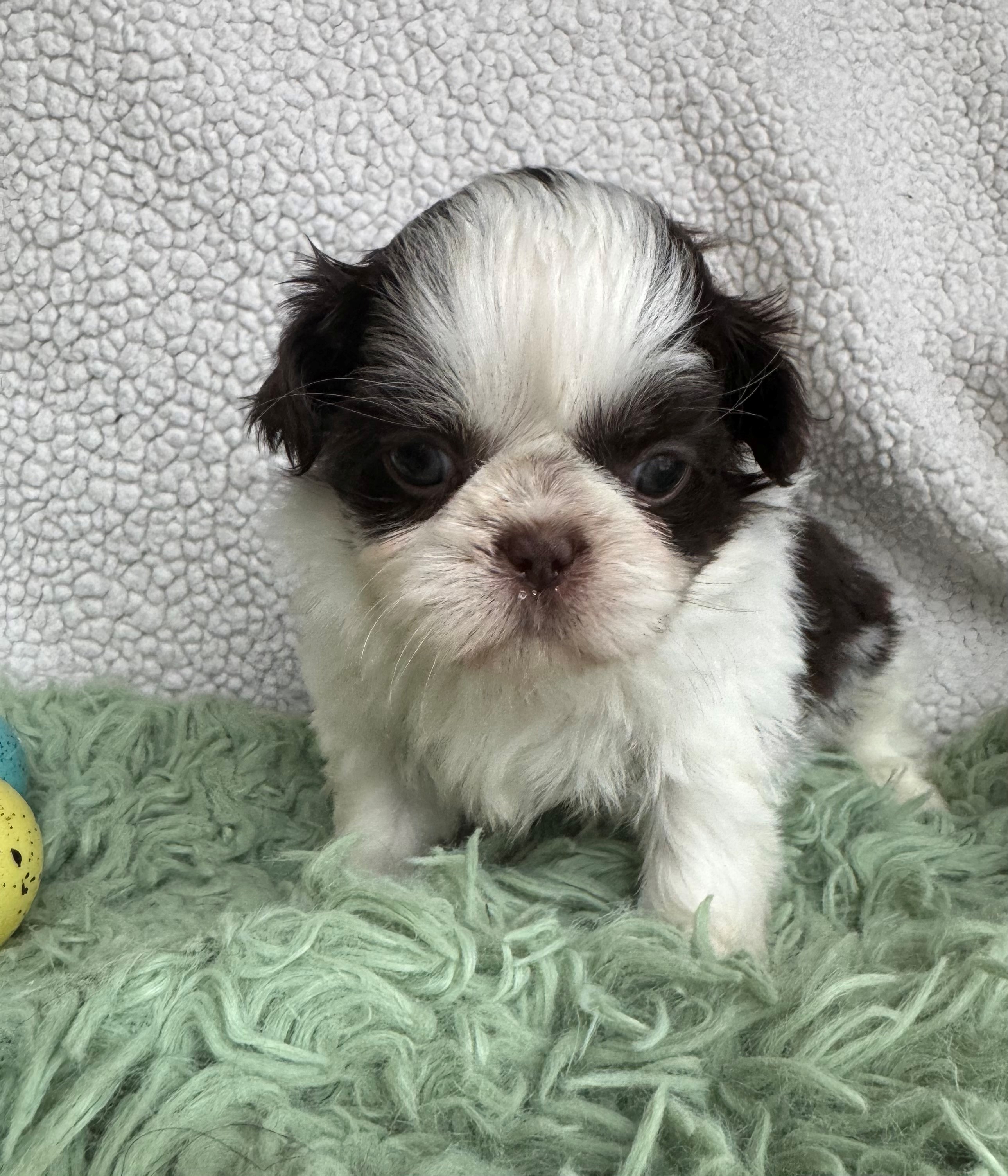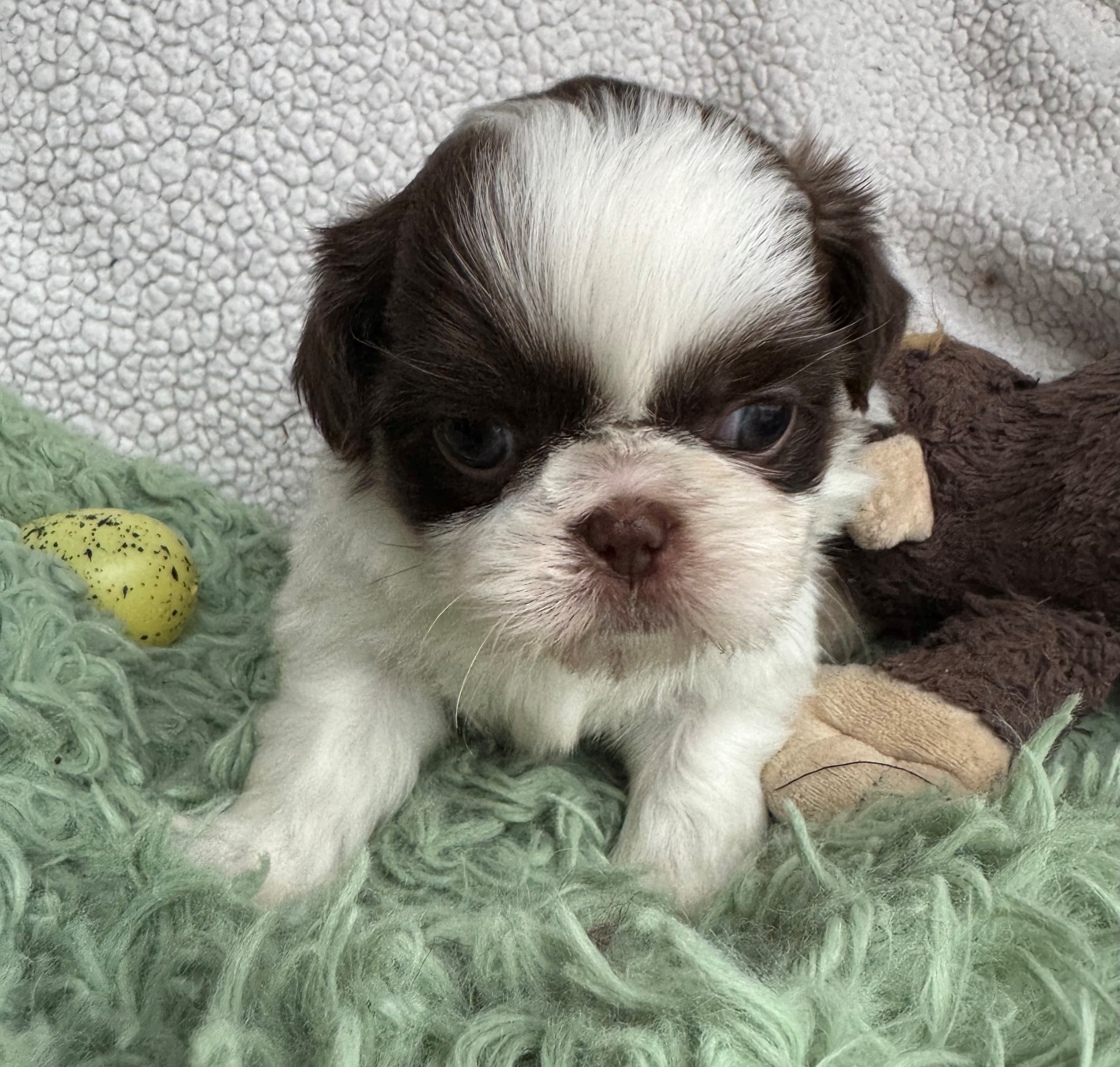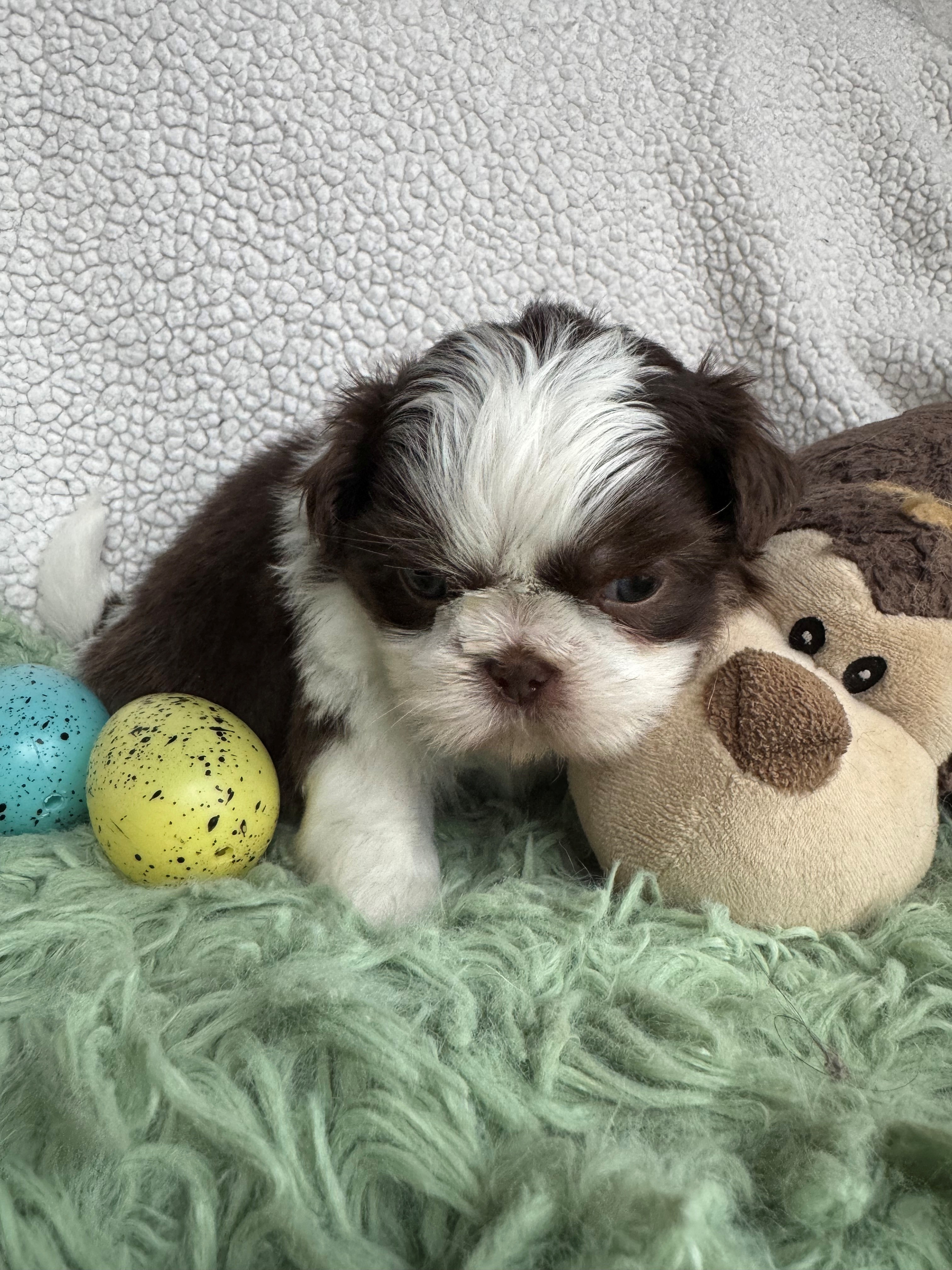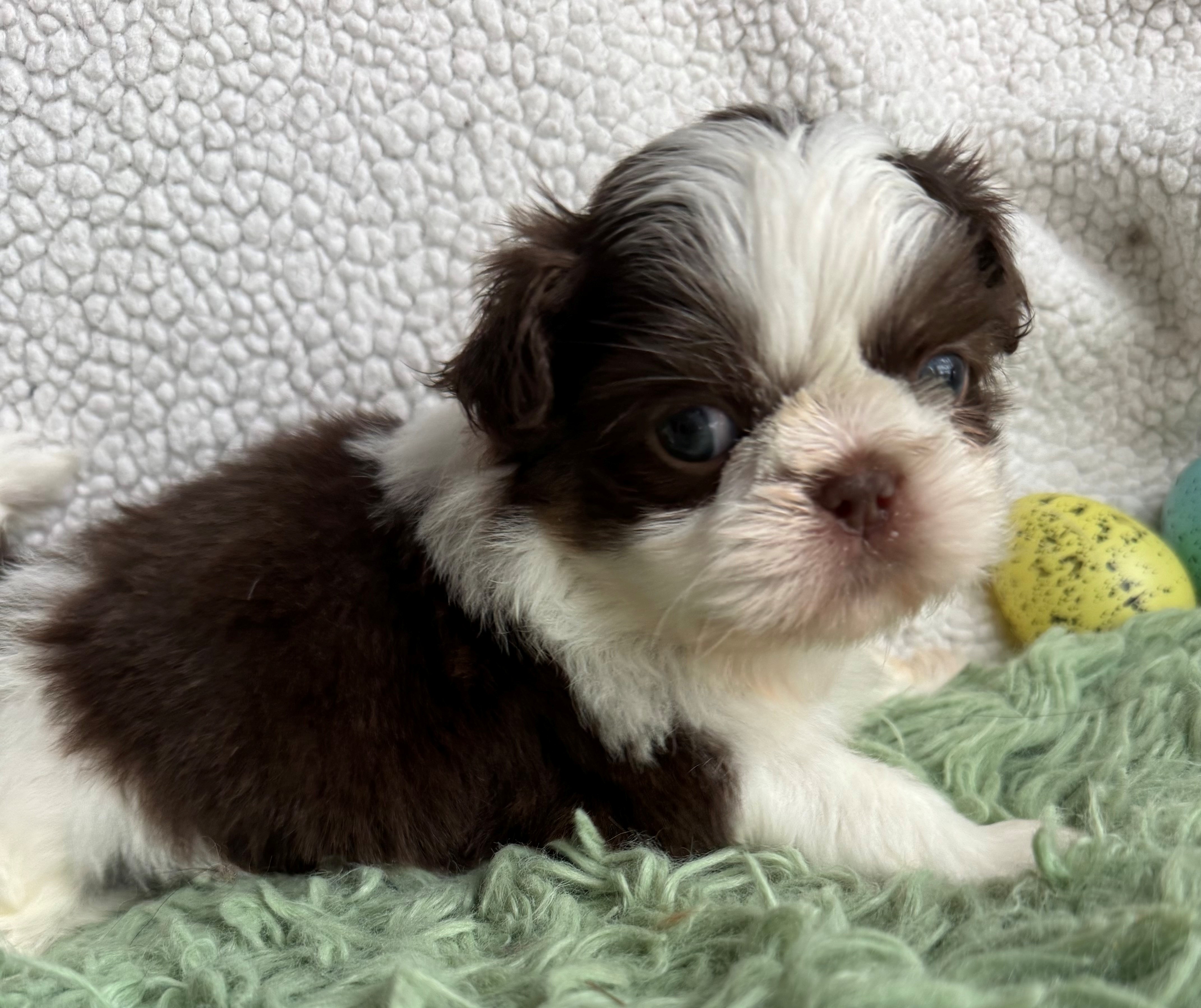 Elsie is our first keeper from Whitney and Basil. She is a liver dobie marked Shih Tzu . She is 10 lbs and she has personality plus. Elsie is in our guardian placement program and comes back home to be bred and then again to give birth and take care of her babies. Elsie carries parti, dobie marked, and solid puppies. Elsie is DNA tested with clear genetics. She is Masterpiece's 2nd generation vax -free. Her puppies are 3rd generation vax-free. $2000